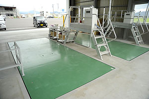 Truck scales are used to weigh at the reception. Actual receiving volume is calculated by the difference in truck weight before and after reception. Two truck scales are equipped at the entrance, and one truck scale is equipped at the exit. At the weighing station before reception, wet paddy samples are taken, pneumatically transferred to the test dryer, and evaluated for yield and quality with the grain quality inspection device, all of which is done automatically and promptly.