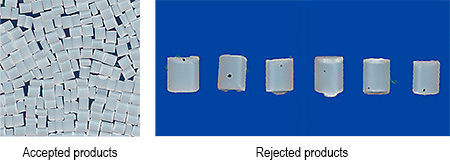 Front and rear cameras are able to see plastic pellets one by one as they are flowing down the belt conveyor. Compressed air from the ejector removes the raw materials as rejected products or foreign materials.
