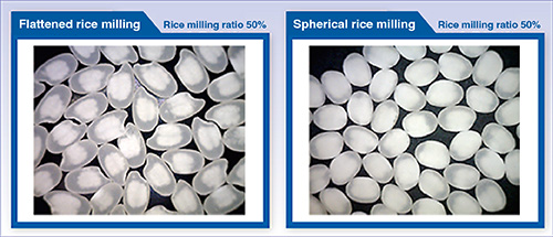 By milling the rice into a flattened shape, unnecessary proteins are removed and the necessary starch is left without waste. However, because crushed rice tends to occur, it has been necessary to mill the rice for a long time. The combination of cBN abrasive roll and air pressure load control device has reduced the processing time for flat milling compared to conventional machines.